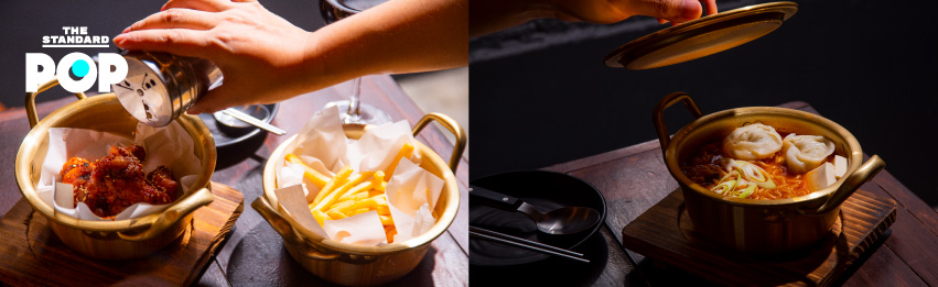 สองอย่างน่าจะพออยู่ท้องและแกล้มดริงก์ได้ดี ชิลไปสักพักเริ่มออกอาการท้องร้อง แนะนำ Rooftop Ramyeon (220 บาท) สไปซี่รามยอนกับเกี๊ยวเกาหลีและเต้าหู้อ่อน เสิร์ฟในหม้อทองเหลืองร้อนๆ อยู่ท้องแน่นอน