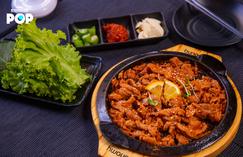 จานหลักต้อง Pork Gogi (330 บาท) หมูย่างกระทะร้อนหมักซอสเกาหลี มาพร้อมชุดผักสำหรับใครที่ชอบรับประทานแบบเมี่ยง หรือจะสั่งข้าวแยกต่างหากก็ได้