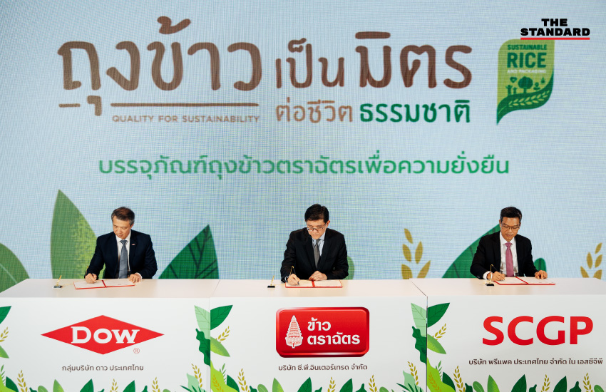 (จากซ้ายไปขวา) ฉัตรชัย เลื่อนผลเจริญชัย ประธานบริหารกลุ่มบริษัท ดาว ประเทศไทย, ฐิติ ลุจินตานนท์ ประธานเจ้าหน้าที่ฝ่ายปฏิบัติการ ธุรกิจการค้าข้าวและอาหารในประเทศและต่างประเทศ กลุ่มธุรกิจข้าวตราฉัตร และ ภราดร จุลชาต กรรมการผู้จัดการ บริษัท พรีแพค ประเทศไทย จำกัด ในเอสซีจีพี (SCGP)