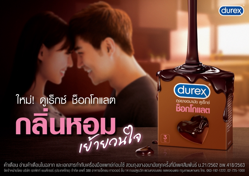 ถ้าคุณอยากเติมความหวานให้กับความสัมพันธ์ Durex เพิ่งจะปล่อยผลิตภัณฑ์ออกมากับ ‘ดูเร็กซ์ ช็อกโกแลต’ พร้อมเป็นตัวช่วยให้ความรักของคุณหอมหวานกว่าเดิม กระตุ้นให้ความรักของคุณกลับมาเหมือนใหม่ หอมหวานเย้ายวนใจด้วยกลิ่นช็อกโกแลต มาในกล่องดีไซน์สะดุดตากับช็อกโกแลตรูปหัวใจที่กำลังหลอมละลาย ทั้งยังมีผิวสัมผัสแบบปุ่มที่เพิ่มความเร่าร้อนให้กับสัมผัสรักของคุณด้วย ขนาดมาตรฐาน 53 มิลลิเมตร ผลิตจากน้ำยางธรรมชาติ มีคุณภาพ ได้มาตรฐาน และมั่นใจได้