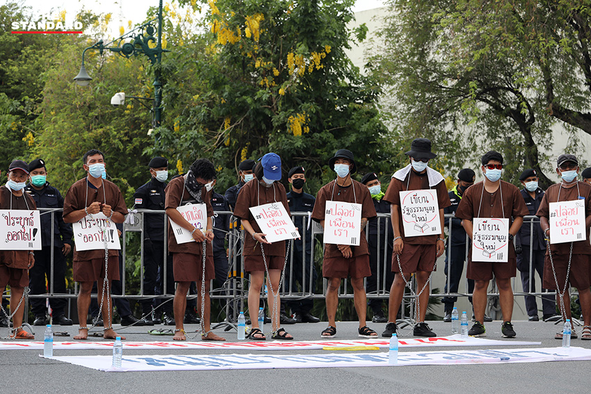 วันนี้ (20 เมษายน) ตั้งแต่เวลา 14.00 น. บริเวณสะพานชมัยมรุเชฐ ทำเนียบรัฐบาล สมาชิกหมู่บ้านทะลุฟ้า นำโดย นวพล ต้นงาม จัดกิจกรรม ‘คนยังคงยืนเด่นโดยท้าทาย 112 นาที’ เป็นการแสดงออกเชิงสัญลักษณ์เพื่อเรียกร้องสิทธิในการประกันตัวแก่แกนนำที่ถูกคุมขังในเรือนจำ ลักษณะกิจกรรมคือ ให้ผู้ที่ร่วมยืนแต่งชุดนักโทษออกศาล มีการห้อยโซ่ตรวนล่ามข้อมือข้อเท้า และห้อยป้ายข้อความข้อเรียกร้องหลักว่า ‘ปล่อยเพื่อนเรา’, ‘เขียนรัฐธรรมนูญใหม่’, ‘ยกเลิก 112’ และ ‘ประยุทธ์ออกไป’