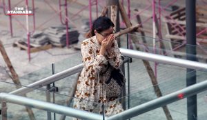 ผู้ที่ไม่ได้สวมใส่หน้ากากอนามัยต่างเอามือปิดจมูก ขณะเดินผ่านโครงการก่อสร้างอาคารบนถนนราชดำริ ที่ก่อให้เกิดฝุ่นละอองจากการก่อสร้าง
