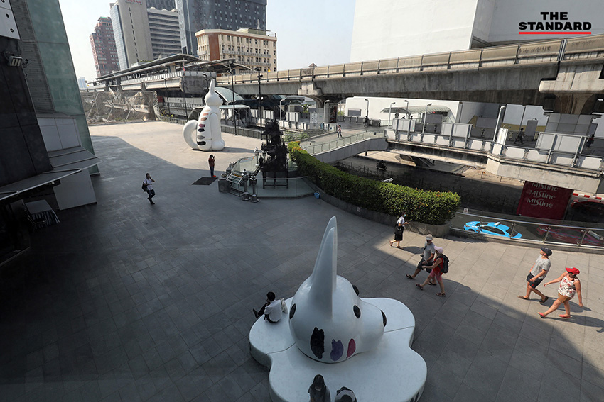 นักท่องเที่ยวทั้งชาวไทยและต่างประเทศ ขณะสัญจรใช้พื้นที่ลานลอยฟ้า