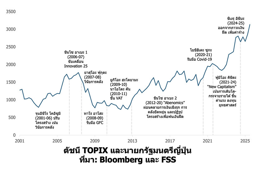 ในฝั่งตลาดทุน แม้ทาคาอิจิอาจไม่ได้ประกาศนโยบายอย่างเฉพาะเจาะจง แต่เชื่อว่าแนวทางของเศรษฐกิจ จะกระทบตลาดทุนในสามเรื่องหลักคือ (1) ผลักดันให้มีโครงการร่วมระหว่างภาครัฐและเอกชน เพื่อสร้างความแข็งแกร่งด้านการลงทุน (2) ส่งเสริมการลงทุนในเทคโนโลยีใหม่ เช่น AI, Quantum, Biotech และ Nuclear เปิดโอกาสให้เกิดบริษัทด้านเทคโนโลยีและอุตสาหกรรมสมัยใหม่ และ (3) ต่อยอดโครงการส่งเสริมสิทธิของผู้ถือหุ้นและการกำกับดูแลกิจการที่ดี เพื่อยกระดับ valuation ของตลาดหุ้นญี่ปุ่น