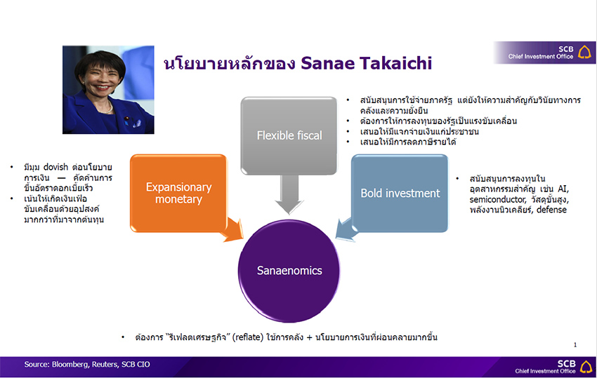 SCB CIO วิเคราะห์ว่า นโยบายของ ทาคาอิชิ จะเป็นการสานต่อความสำเร็จของนโยบาย Abenomics แต่มาในแนวคิดใหม่ที่เรียกว่า Ega-nomics ซึ่งมุ่งเน้นการใช้เครื่องมือทั้งนโยบายการเงินและการคลังควบคู่กัน พร้อมทั้งสอดรับกับการจัดการความท้าทายในยุคปัจจุบัน ได้แก่ ปัญหาเงินเฟ้อ เทคโนโลยี และความมั่นคงทางภูมิรัฐศาสตร์ (Geopolitical Security)