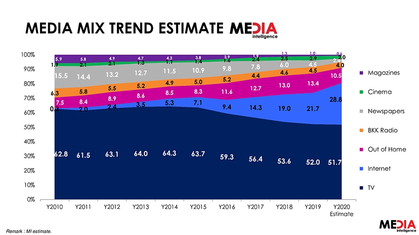 “โดยสรุปภาพรวมอุตสาหกรรมสื่อโฆษณาปีนี้ยังคงน่าจะไม่สดใสอย่างต่อเนื่องจากปีก่อน ภูมิทัศน์ของสื่อโฆษณาในปีนี้ที่อาจจะแตกต่างเป็นพิเศษ Broadcast TV และ Online มีบทบาทสำคัญต่อเม็ดเงินโฆษณาในปีนี้มากขึ้น ในขณะที่สื่อ OOH ถูกลดบทบาทลงจากสถานการณ์โควิด-19”