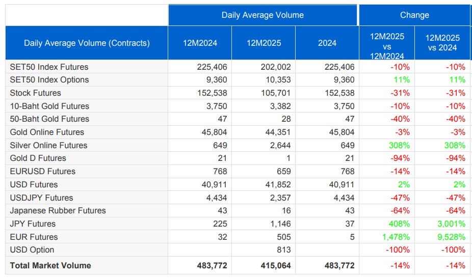 โดยในปี 2568 มีปริมาณสัญญาซื้อขายเฉลี่ยต่อวัน 415,064 สัญญา ลดลง 14% จาก 483,772 สัญญาในปี 2567 ขณะที่ ในอดีตช่วงที่หุ้นไทยถึงจุดพีค เคยมีปริมาณซื้อขายสัญญาสูงถึง 600,000 สัญญาต่อวัน ปัจจุบันจำนวนนักลงทุนในตลาด TFEX มีสัดส่วนเพียง 10% ของจำนวนนักลงทุนในตลาดหุ้นไทยทั้งหมด 4 ล้านคน