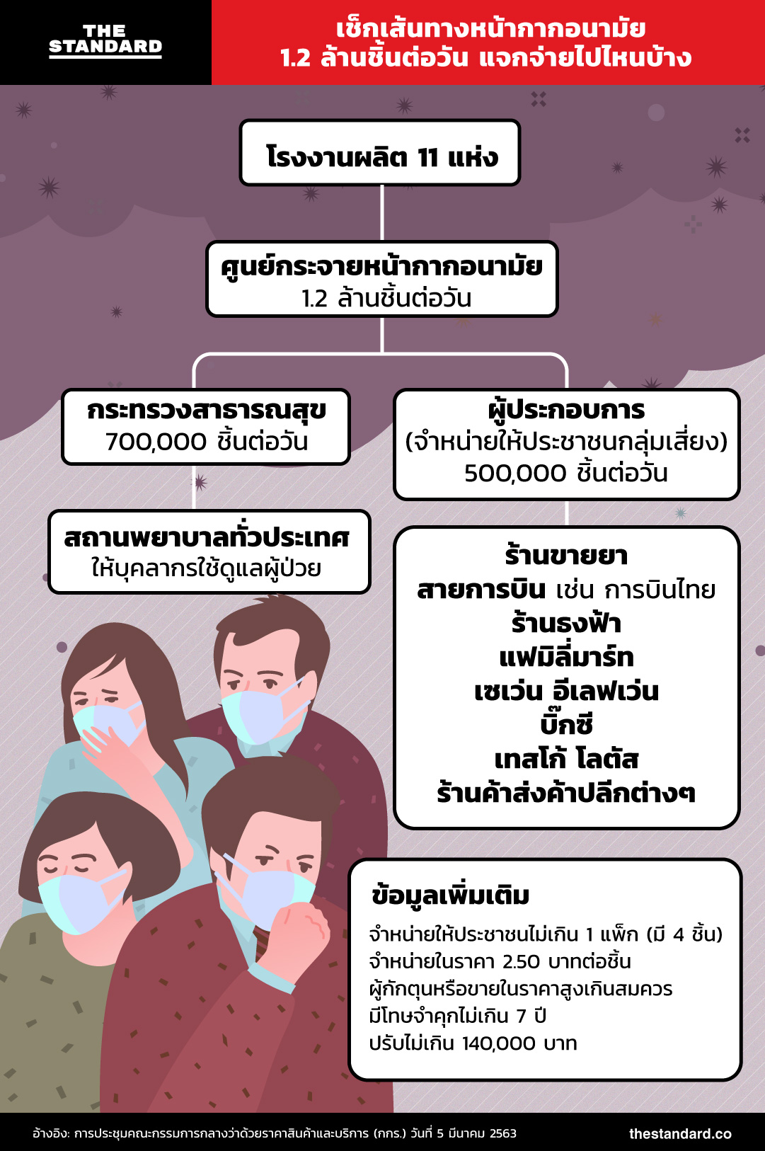 THE STANDARD ได้รวบรวมข้อมูล พร้อมกางผังแจกจ่ายหน้ากาก โดยศูนย์กระจายหน้ากากอนามัยให้ผู้อ่านได้เห็นกันว่า เส้นทางหน้ากากที่จะผลิตได้ 1.2 ล้านชิ้นต่อวัน ถูกจัดแจงให้ไปอยู่ที่ไหนบ้าง