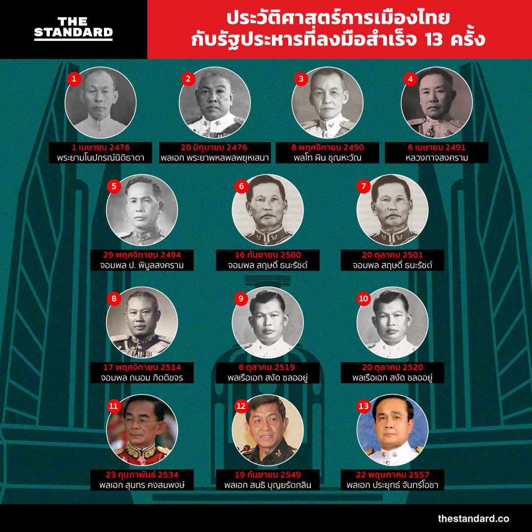 THE STANDARD รวบรวมข้อมูลเหตุการณ์รัฐประหารตลอด 13 ครั้งที่ผ่านมา ว่าแต่ละเหตุการณ์เกิดเมื่อไร และใครเป็นผู้นำในการรัฐประหารแต่ละครั้ง