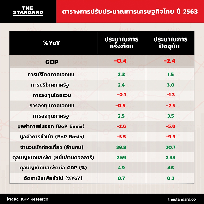 วันนี้ (20 มกราคม) KKP Research เปิดเผยว่าปี 2563 คาดว่าการเติบโตของเศรษฐกิจไทยจะติดลบเพิ่มขึ้นเป็น -2.4% จากก่อนหน้านี้ที่ประเมินว่าเศรษฐกิจไทยจะหดตัว -0.4% โดยประเมินว่าสถานการณ์การแพร่ระบาดของโควิด-19 จะรุนแรงและขยายวงกว้างขึ้น โดยเฉพาะในยุโรปและสหรัฐอเมริกา ขณะเดียวกันต้องจับตามองการยกระดับมาตรการควบคุมการระบาดในประเทศไทย