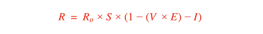 และค่าระดับการติดเชื้อขึ้นอยู่กับสัดส่วนของคนที่มีภูมิคุ้มกันแล้วด้วย เช่น ถ้าตัวโรคเองมีความสามารถในการแพร่กระจายได้ 3 คนโดยเฉลี่ย แต่ในกลุ่มประชากรโดยเฉลี่ยได้รับวัคซีนและมีภูมิคุ้มกันไปแล้วครึ่งหนึ่ง แปลว่าอัตราการติดเชื้อของโรคอาจจะลดลงเหลือแค่ 1.5 โดยเฉลี่ยก็ได้ เราอาจจะเขียนเป็นสมการได้ว่า