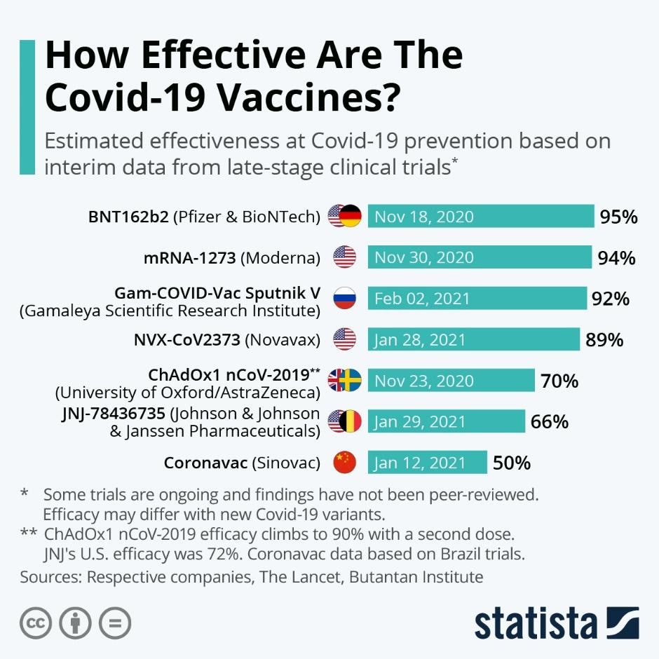 วัคซีน 2 ตัวที่รัฐบาลไทยเราจะจัดซื้อมาให้คนไทยใช้คือ Oxford / AstraZeneca ของอังกฤษ และ Sinovac ของจีน โดย AstraZeneca มีประสิทธิผลอยู่ที่ราว 70% ประสิทธิผลของวัคซีน Sinovac อยู่ที่ประมาณ 50% ถ้าเปรียบเทียบกับวัคซีนตัวอื่นๆ แล้วถือว่ามีประสิทธิผลต่ำกว่า วัคซีนอย่าง Pfizer และ Moderna ที่ใช้กันมากในสหรัฐอเมริกาและอิสราเอล มีรายงานผลวิจัยว่าประสิทธิผลสูงถึง 95%