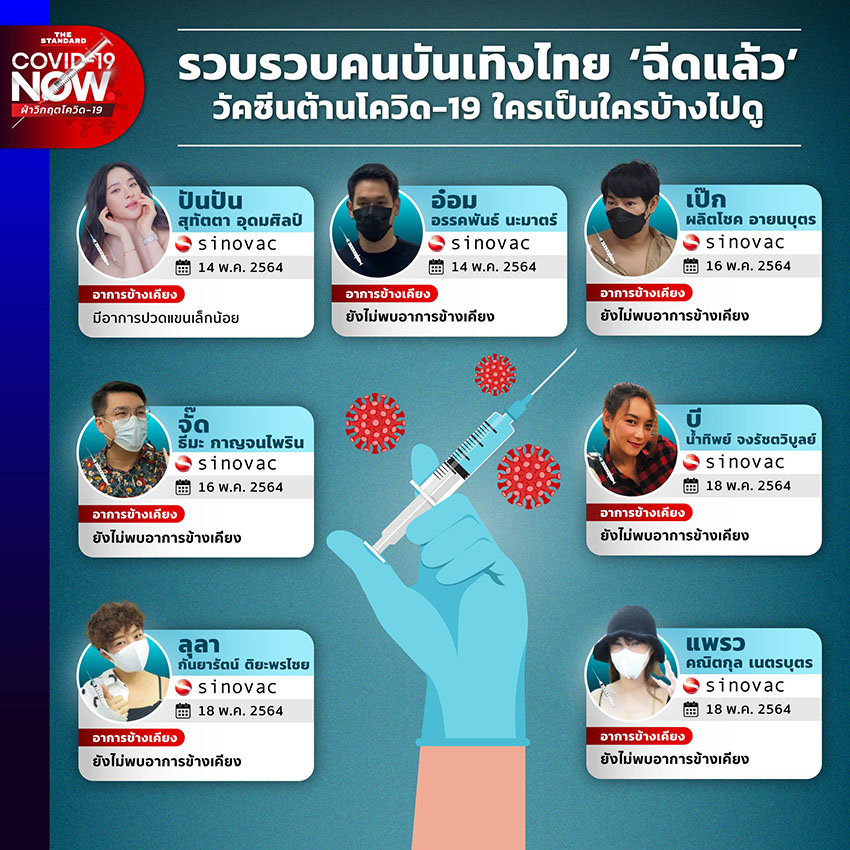 และแน่นอนที่สุดในฐานะสื่อ THE STANDARD POP ได้รวบรวมรายชื่อคนบันเทิงไทยที่เราพอจะรวบรวมได้ ‘ส่วนหนึ่ง’ ว่าใครบ้างที่ได้รับการฉีดวัคซีนเป็นที่เรียบร้อยแล้ว