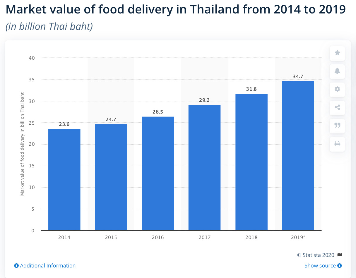 ขณะที่เมื่อจำแนกลงมาเจาะเฉพาะตลาดฟู้ดเดลิเวอรีก็จะพบว่า มูลค่าของตลาดนี้ในปี 2562 ที่ผ่านมา อยู่ที่ประมาณ 3.5 หมื่นล้านบาท ซึ่งเติบโตจากปีก่อนหน้าที่ราว 9% (เทียบเคียงกับชุดข้อมูลการประเมินมูลค่าตลาดโดยเว็บไซต์ Statista)