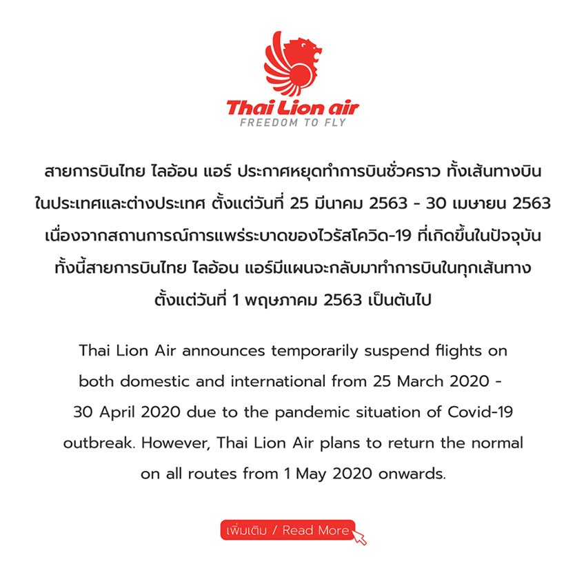 สายการบินไทยไลอ้อนแอร์ ประกาศผ่านทางแฟนเพจเฟซบุ๊กและเว็บไซต์ ขอหยุดทำการบินชั่วคราวทั้งเส้นทางบินในประเทศและต่างประเทศ ตั้งแต่วันที่ 25 มีนาคม 2563 ถึง 30 เมษายน 2563 เนื่องจากสถานการณ์การแพร่ระบาดของโควิด-19 ที่เกิดขึ้นในปัจจุบัน โดยมีแผนจะกลับมาบินในทุกเส้นทางตั้งแต่วันที่ 1 พฤษภาคม 2563 เป็นต้นไป