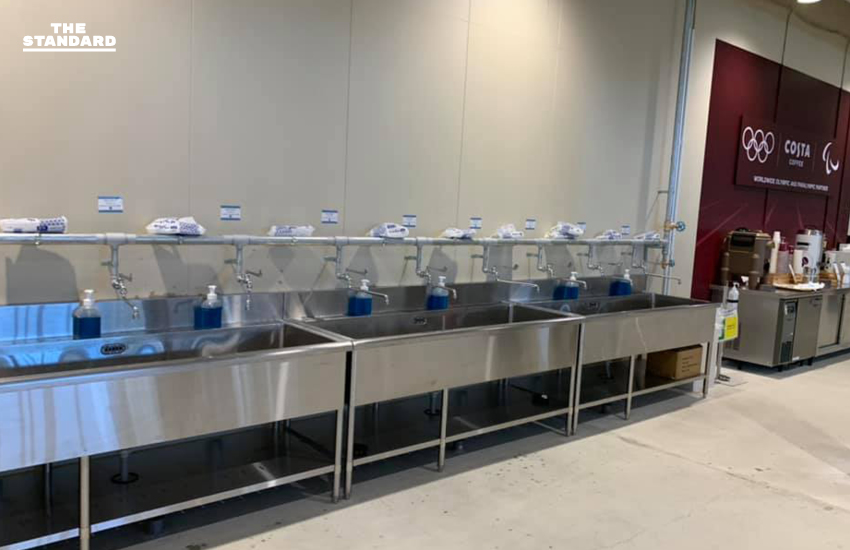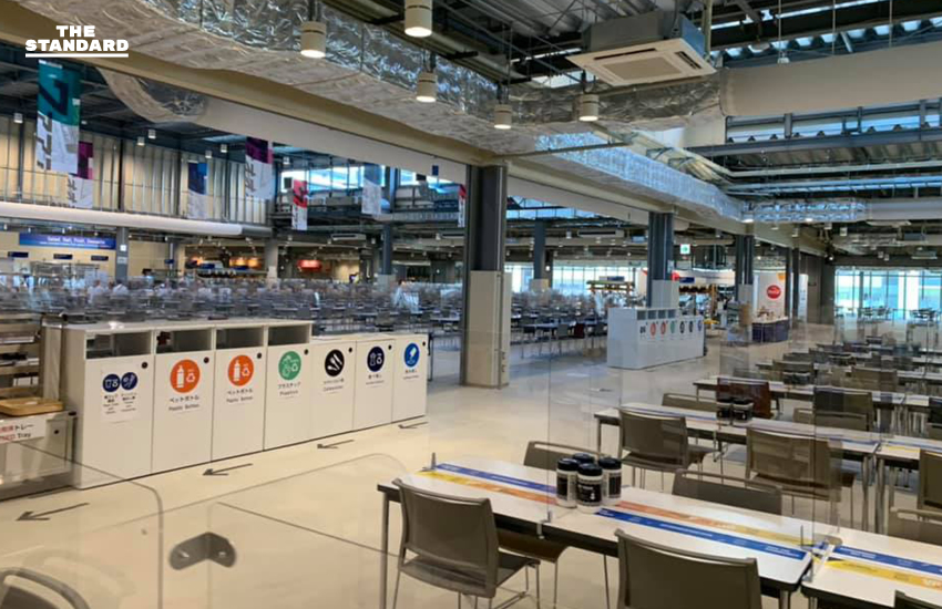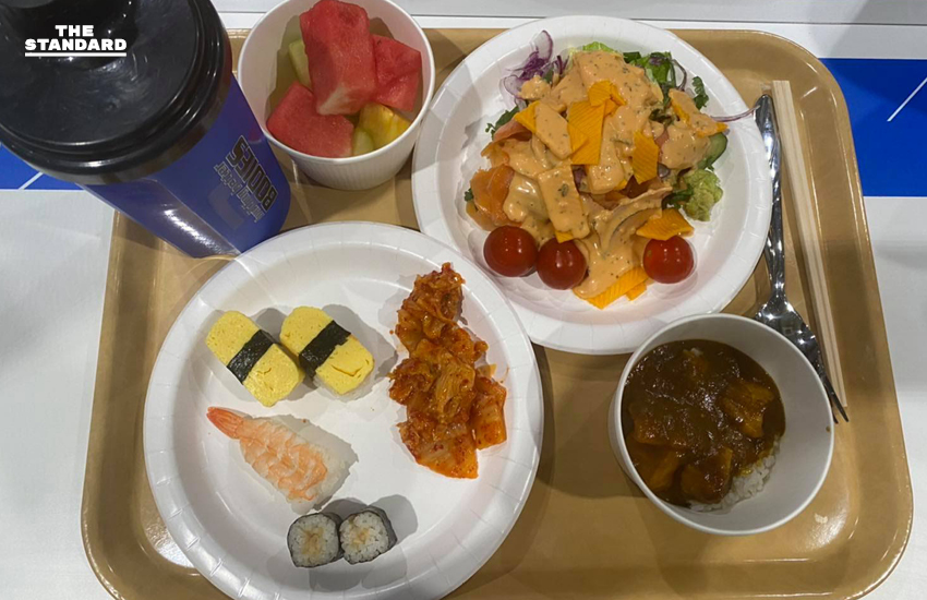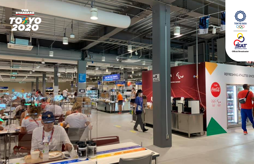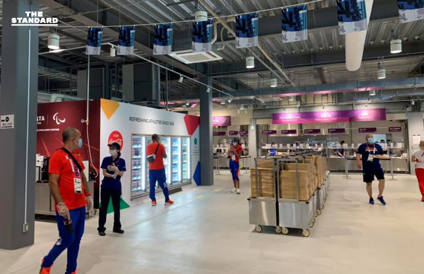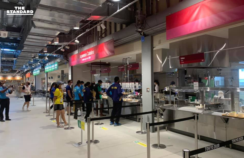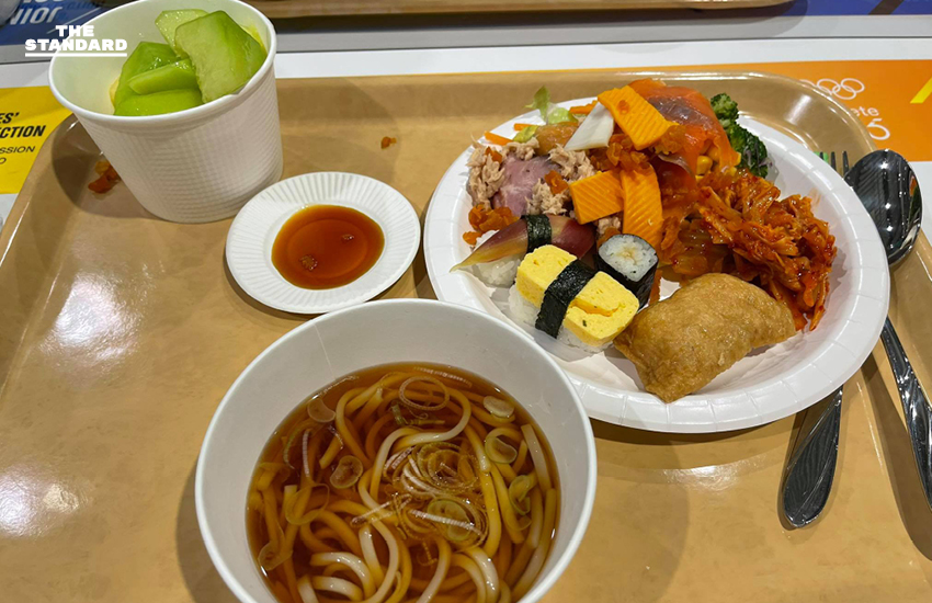 เริ่มจากโรงอาหารครั้งนี้ จุดเริ่มต้นทุกคนจะต้องล้างมือตรงจุดให้บริการก่อนเข้าไปพบกับเมนูอาหารนานาชาติ โดยอาหารที่เสิร์ฟภายในโรงอาหารประกอบไปด้วยเมนูกว่า 700 ชนิด รวมถึงเมนูชื่อดังของญี่ปุ่น อย่างโอโคโนมิยากิและเทปันยากิ ซึ่งทาง เงือกจอย-เจนจิรา ศรีสอาด นักกีฬาว่ายน้ำทีมชาติไทย ได้ส่งภาพเมนูอาหารญี่ปุ่น ซึ่งเป็นเมนูที่ได้รับความนิยมสูงในโรงอาหารมาให้กับ THE STANDARD