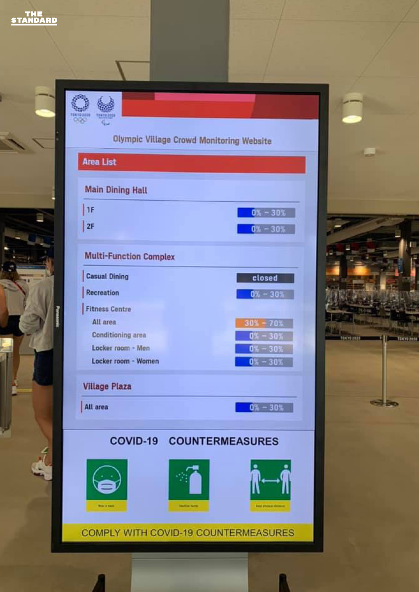 พร้อมกันนี้ในโรงอาหารจะมีกล้องวงจรปิดไว้คอยตรวจจับความแน่นหนาของผู้คนในโรงอาหาร ซึ่งฝ่ายจัดก่อนหน้านี้ได้เปิดเผยว่า มาตรการในโรงอาหารที่สามารถนั่งได้ประมาน 4,500 ที่นั่ง จะเปิดให้นั่งเพียง 2 ใน 3 ของพื้นที่ทั้งหมด และจะให้นักกีฬาแยกกันนั่งรับประทาน โดยมีกรอบพลาสติกกั้นระหว่างที่นั่ง