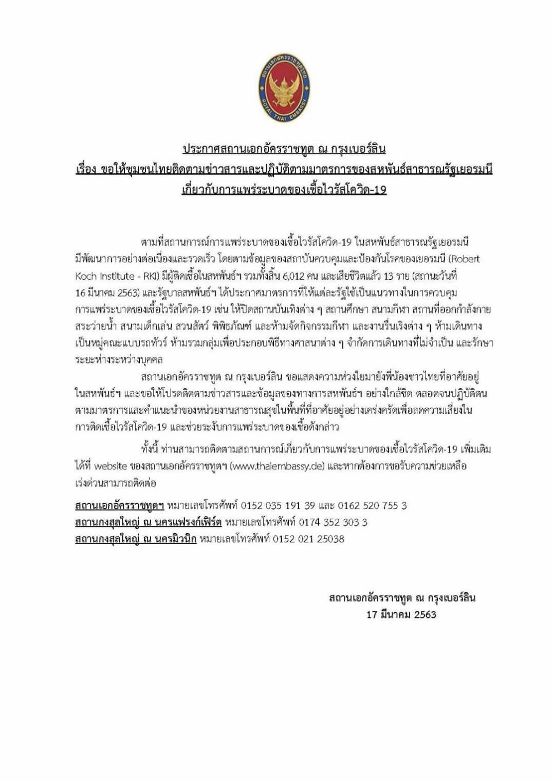 สถานเอกอัครราชทูต ณ กรุงเบอร์ลิน สหพันธ์สาธารณรัฐเยอรมนี ออกประกาศขอให้คนไทยในเยอรมนีปฏิบัติตามมาตรการของเยอรมนีอย่างเคร่งครัด เพื่อลดความเสี่ยงติดโรคโควิด-19 หลังยอดระบาดพุ่ง 6,012 คนแล้ว เสียชีวิต 13 ราย