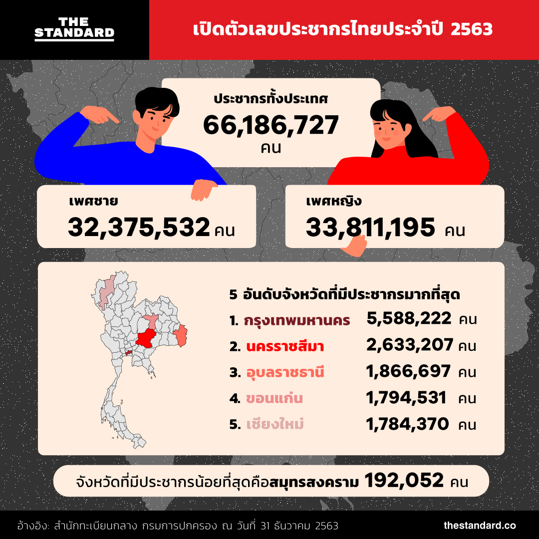 สำนักทะเบียนกลาง กรมการปกครอง กระทรวงมหาดไทย ได้ออกประกาศ เรื่อง จำนวนราษฎรทั่วราชอาณาจักร ตามหลักการทะเบียนราษฎร ณ วันที่ 31 ธันวาคม 2563 แล้ว พบว่าประเทศไทยมีราษฎรเพศหญิงมากกว่าเพศชายตามรายละเอียดดังต่อไปนี้