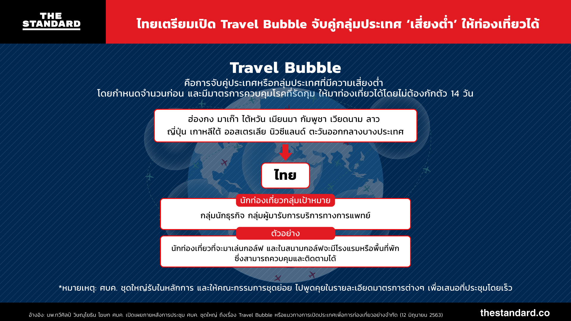 (12 มิถุนายน) นพ.ทวีศิลป์ วิษณุโยธิน โฆษกศูนย์บริหารสถานการณ์การแพร่ระบาดของโรคติดเชื้อไวรัสโคโรนา 2019 (ศบค.) เปิดเผยภายหลังการประชุม ศบค. ชุดใหญ่ถึงเรื่อง Travel Bubble หรือแนวทางการเปิดประเทศเพื่อการท่องเที่ยวอย่างจำกัด ซึ่งต้องเลือกเป้าหมายประเทศที่มีความสามารถควบคุมการระบาดที่ดี และมีมาตรการตรวจเชื้ออย่างเข้มงวดตั้งแต่ก่อนออกนอกประเทศ ตรวจซ้ำเมื่อถึงประเทศเรา และต้องซื้อประกันสุขภาพเพื่อไม่ให้เป็นภาระค่าใช้จ่ายหากเจ็บป่วย โดยจะยกเว้นให้คนกลุ่มนี้สามารถท่องเที่ยวได้โดยไม่ต้องกักตัว 14 วัน