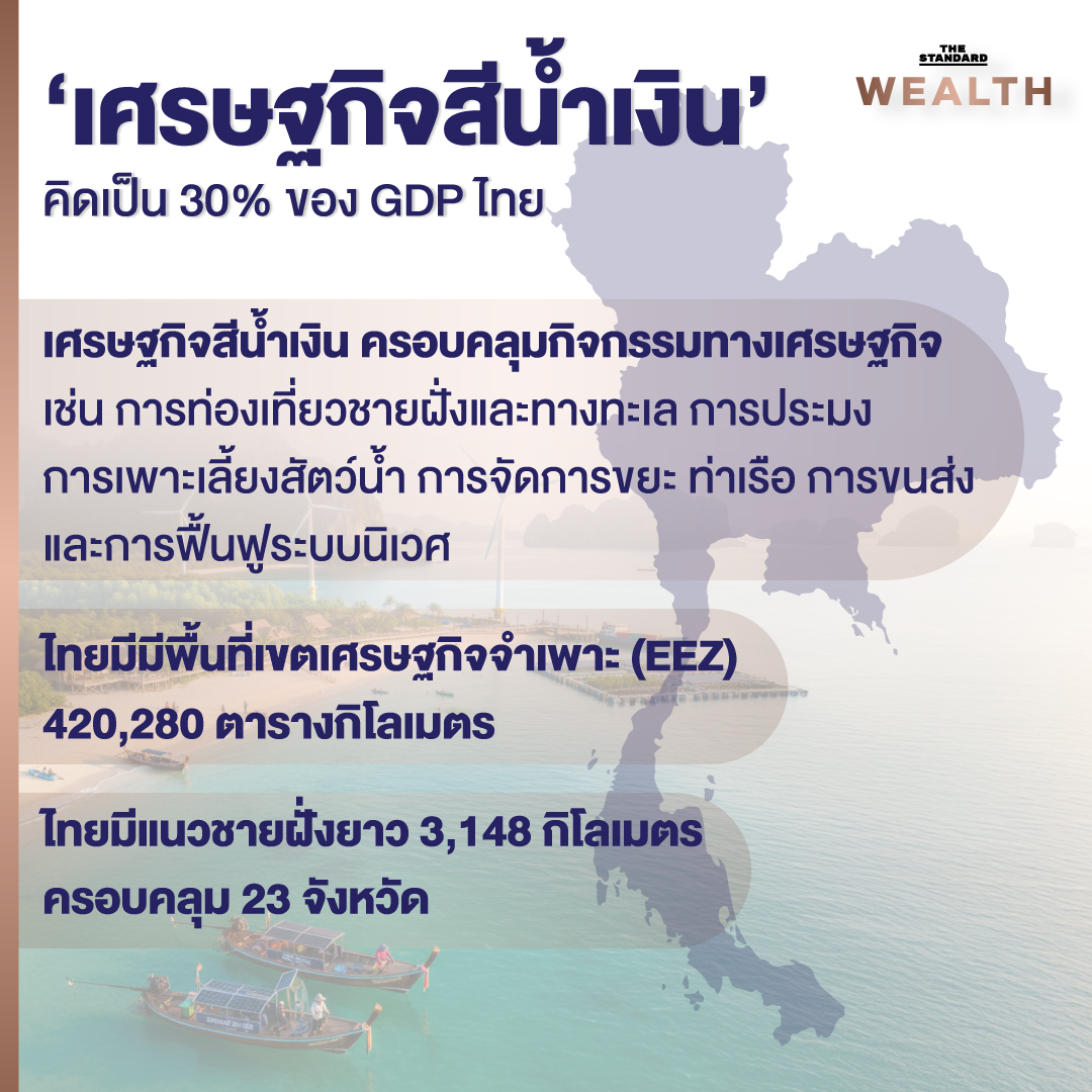 ภาคส่วนต่างๆ ที่เกี่ยวข้องกับ ‘เศรษฐกิจสีน้ำเงิน’ เช่น การท่องเที่ยวชายฝั่งและทางทะเล การประมง การเพาะเลี้ยงสัตว์น้ำ การจัดการขยะ ท่าเรือ การขนส่ง และการฟื้นฟูระบบนิเวศ คิดเป็นสัดส่วนประมาณ 30% ของ GDP ไทย