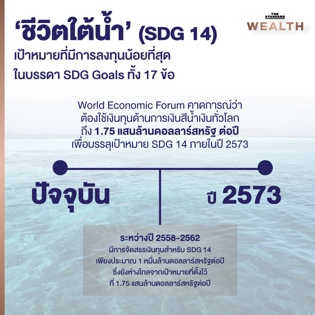 The World Economic Forum ประเมินว่าการบรรลุเป้าหมายการพัฒนาที่ยั่งยืนข้อที่ 14 ‘ชีวิตใต้ท้องทะเล’ (Life Below Water) ภายในปี 2573 ต้องใช้เงินทุน 175 พันล้านดอลลาร์สหรัฐต่อปี อย่างไรก็ตาม ระหว่างปี 2558 ถึง 2562 มีการจัดสรรเงินทุนเพียงประมาณ 1 หมื่นล้านดอลลาร์สหรัฐเท่านั้น สำหรับเป้าหมายนี้ ทำให้เป็นเป้าหมายที่ได้รับเงินทุนน้อยที่สุดใน 17 เป้าหมายการพัฒนาที่ยั่งยืน