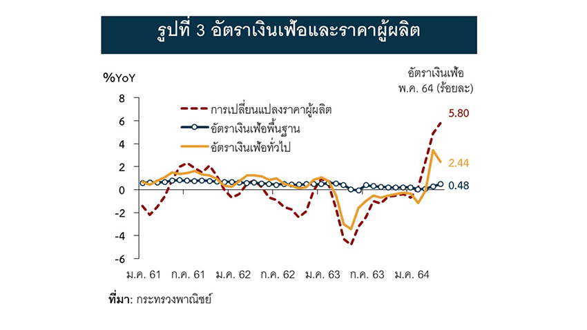โดยสรุป อัตราเงินเฟ้อไทยที่เพิ่มสูงขึ้นคาดว่าจะเป็นเพียงปัจจัยชั่วคราวจากฐานที่ต่ำของราคาน้ำมันและมาตรการลดค่าครองชีพของรัฐ และเงินเฟ้อโลก-ราคาสินค้าโภคภัณฑ์ที่เพิ่มขึ้นส่งผลต่ออัตราเงินเฟ้อไทยจำกัดในระยะต่อไปอุปสงค์ในประเทศที่ยังไม่ฟื้นตัวดี ประกอบกับปัจจัยเชิงโครงสร้างที่ถูกเร่งขึ้นในช่วงการระบาดและแนวโน้มราคาน้ำมันที่จะไม่เร่งตัวขึ้นสูง จะทำให้แนวโน้มเงินเฟ้อไทยยังอยู่ในระดับต่ำต่อเนื่องไปอีกระยะหนึ่ง