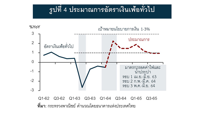 ในช่วงที่ผ่านมายังไม่พบการส่งผ่านราคาสินค้าและเงินเฟ้อโลกที่สูงมายังเงินเฟ้อไทยอย่างชัดเจน แม้ว่าเงินเฟ้อไทยเฉลี่ย 2 เดือนแรกของไตรมาสที่ 2 ปี 2564 อยู่ที่ร้อยละ 2.9 ซึ่งสูงกว่าค่าเฉลี่ยในอดีต แต่เป็นเพียงการปรับเพิ่มขึ้นชั่วคราว เนื่องจากฐานราคาน้ำมันดิบที่อยู่ในระดับต่ำ รวมถึงการลดค่าไฟฟ้าและค่าน้ำประปาเพื่อบรรเทาค่าครองชีพในปี 2563 โดยคาดว่า เมื่อผลของฐานที่ต่ำหมดลงในไตรมาส 3 ปี 2564 เงินเฟ้อจะทยอยลดลงและเคลื่อนไหวอยู่ใกล้เคียงกับขอบล่างของกรอบนโยบายการเงิน (รูปที่ 4) เนื่องจาก