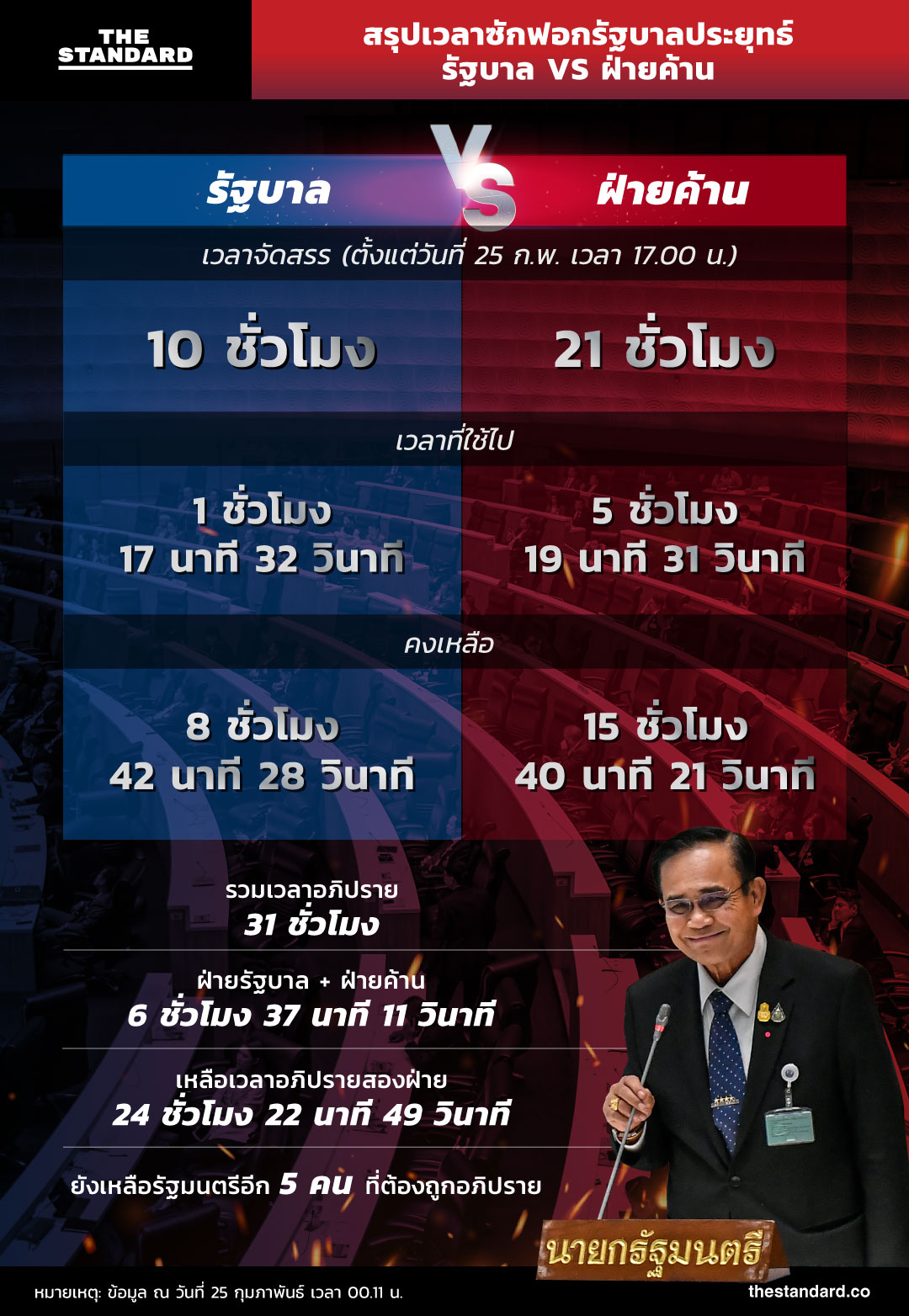 การอภิปรายไม่ไว้วางใจผ่านมาแล้ว 2 วัน วันนี้เข้าสู่วันที่ 3 ทั้งสองฝ่ายมีประเด็นประท้วงเรื่องกรอบเวลา ทำให้ต้องมีการตกลงกันโดยเริ่มต้นจัดสรรเวลาการอภิปรายนับตั้งแต่เวลา 17.00 น. ของวันที่ 25 กุมภาพันธ์ และนี่คือรายละเอียดที่ฝ่ายค้านและรัฐบาลได้ใช้ในการซักฟอก ประท้วง และตอบชี้แจง