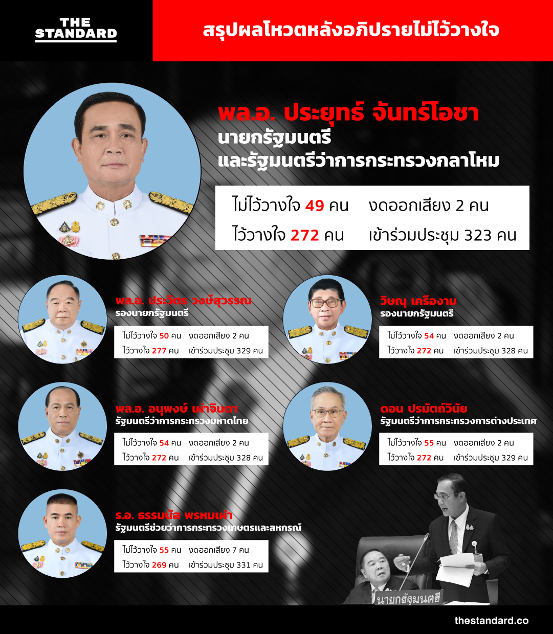 หลังการอภิปรายไม่ไว้วางใจที่ลากยาวตั้งแต่วันที่ 24-27 กุมภาพันธ์ที่ผ่านมา วันนี้ (28 กุมภาพันธ์) ที่ประชุมสภาฯ ได้มีมติลงคะแนนในญัตติไม่ไว้วางใจคณะรัฐมนตรีที่ถูกอภิปราย ซึ่งผลปรากฏว่า นายกรัฐมนตรีและรัฐมนตรีที่เป็นเป้าหมายของการอภิปรายไม่ไว้วางใจครั้งนี้ได้รับความไว้วางใจให้ทำหน้าที่ต่อทั้งหมด มีแต่คะแนนเสียงที่แตกต่างกันออกไป ซึ่งแม้จะไม่มาก แต่ก็เพียงพอที่จะสร้างรอยร้าวทางการเมืองได้ไม่น้อย และนี่คือผลคะแนนทั้งหมดที่เกิดขึ้น