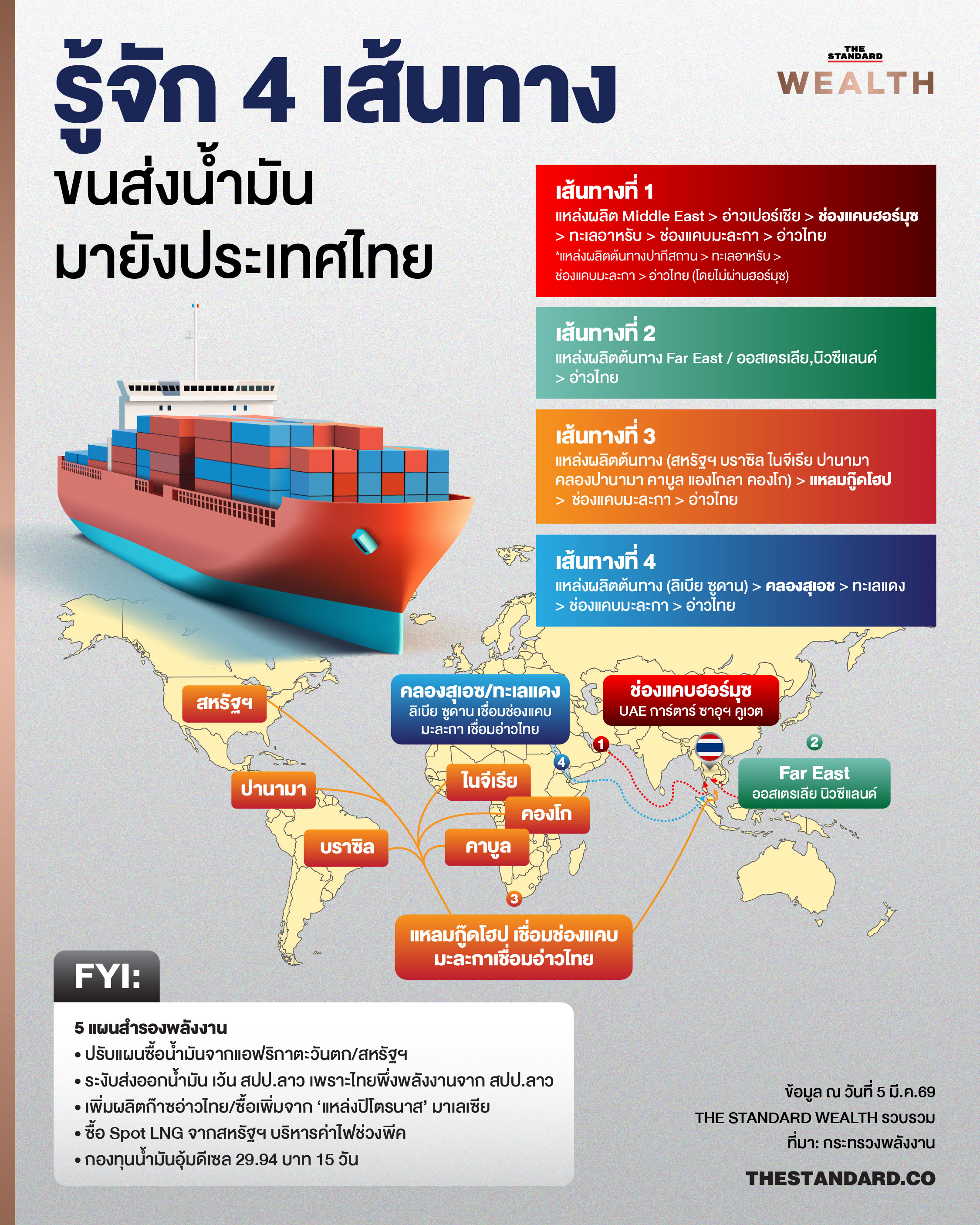 THE STANDARD WEALTH ชวนทำความเข้าใจ 4 เส้นทางขนส่งน้ำมันดิบของไทย พร้อมสำรวจทางเลือกหากจำเป็นต้องหลีกเลี่ยงช่องแคบฮอร์มุซ ว่าไทยยังมีแหล่งจัดหาพลังงานใดรองรับได้บ้าง