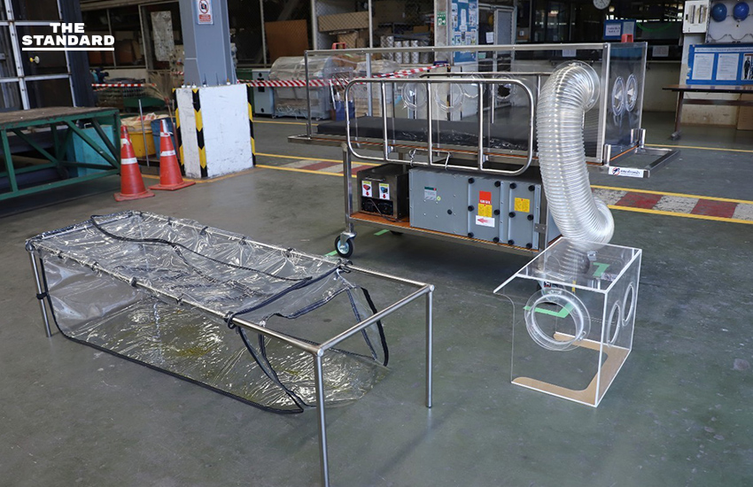 2) Patient Transportation Chamber: อุปกรณ์ติดเสริมเตียงเคลื่อนย้าย ด้วยระบบแรงดันลบ เพื่อป้องกันการแพร่กระจายของเชื้อไวรัส ในระหว่างเคลื่อนย้ายจากจุดหนึ่งไปยังอีกจุดหนึ่ง