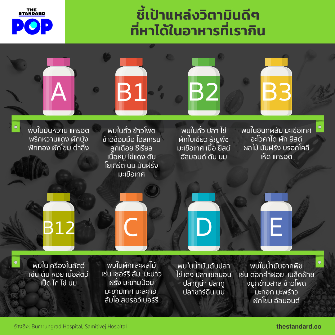 คนที่รักและใส่ใจสุขภาพมักจะสรรหาวิธีมาเติมเต็มความแข็งแรงให้กับร่างกาย ทั้งการเลือกรับประทานอาหารที่ดีมีประโยชน์ การออกกำลังกายเป็นประจำ รวมถึงการเสริมด้วยวิตามิน ซึ่งเป็นสารที่มีความจำเป็นต่อร่างกายในด้านสุขภาพ แม้การเลือกรับวิตามินในรูปแบบของอาหารเสริมจะสะดวกมากกว่า แต่เราแนะนำว่าการรับประทานอาหารเสริมแก่ร่างกายผ่านอาหารโดยตรงก็เป็นทางเลือกที่ดีและประหยัด THE STANDARD POP จะพาไปเช็กลิสต์ว่าในอาหารแต่ละประเภทมีวิตามินดีๆ อะไรบ้าง