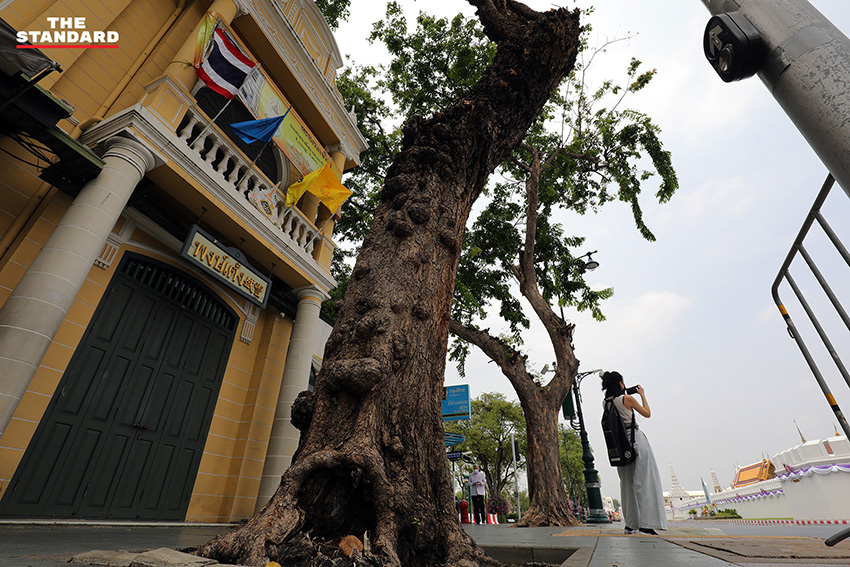 THE STANDARD ลงพื้นที่สำรวจโดยรอบแนวเขตก่อสร้างที่บริเวณถนนมหาราชพบว่ากำลังมีการปรับพื้นที่ โดยเจ้าหน้าที่ได้ล้อมย้ายต้นไม้และกั้นเขตเป็นแนวก่อสร้าง ขณะที่บริเวณถนนหน้าพระลานจะมีการล้อมย้ายต้นไม้ใหญ่บริเวณที่ทำการไปรษณีย์ประมาณ 2 ต้น และกำลังล้อมย้ายต้นไม้ในพื้นที่กึ่งกลางถนนซึ่งมีลักษณะสามเหลี่ยม ติดกับถนนหน้าพระลานด้วย