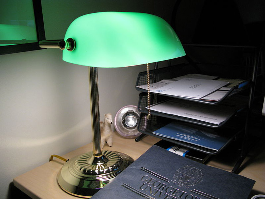 เจ้าโคมไฟเขียวตัวนี้มีชื่อเล่นภาษาอังกฤษว่า Banker’s Lamp หรือโคมไฟของนายธนาคาร ส่วนชื่อจริงก็คือ Emeralite Lamp ที่มาจากสีเขียวเหมือนมรกตของส่วนโคม ซึ่งเป็นจุดสะดุดตาที่สุด ไล่เรียงลงมาถึงก้านของโคมสีทองเหลือง ทำพื้นผิวเซาะร่องคล้ายกับเสาโรมัน ความโค้งมนไล่เรียงตั้งแต่ส่วนบนลงมาจนถึงฐานล่างที่บานออกเหมือนกลีบดอกไม้ ซึ่งแม้จะเป็นงานผลิตโคมไฟในระบบอุตสาหกรรม แต่ก็ยังคงความคลาสสิกในรูปแบบของงานศิลปะ