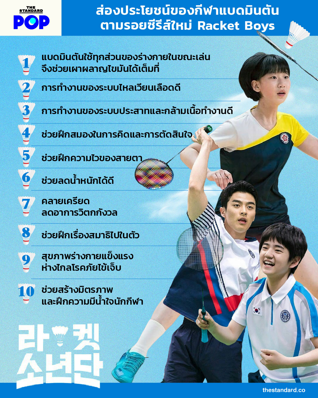 แม้ว่าซีรีส์เรื่องใหม่เอี่ยมอย่าง Racket Boys เพิ่งจะฉายทาง Netflix ไปได้เพียง 2 ตอน แต่ด้วยเรื่องราวที่ดำเนินไปอย่างสนุก ผ่านตัวละคร ยุนแฮกัง นักเบสบอลระดับมัธยมจากโรงเรียนในกรุงโซล ที่จับพลัดจับผลูมาลงแข่งกีฬาแบดมินตันในโรงเรียนชนบทกับเพื่อนใหม่ในทีมทั้ง บังยุนดัม หัวหน้าทีมหน้าตาดี นาอูซาน ผู้หลงใหลในวัฒนธรรมฮิปฮอป และน้องเล็ก อียงแท ที่มีความรอบรู้เรื่องกีฬาแบดมินตันเป็นอย่างดี เคมีของตัวละครทั้งหมดเข้าขากันได้ดี แต่ละคนมีคาแรกเตอร์ที่เป็นเอกลักษณ์ของใครของมัน ทำให้ซีรีส์เรื่อง Racket Boys เป็นหนึ่งในซีรีส์ที่ดูเพลินได้ทั้งครอบครัวแม้จะฉายไปแค่ 2 อีพี แต่บอกเลยว่านี่เป็นซีรีส์ที่จะปลุกไฟให้คุณอยากกลับมาเล่นกีฬาแบดมินตันอีกครั้ง และต่อไปนี้คือประโยชน์ที่ได้จากการออกกำลังกายด้วยการตีแบดมินตัน