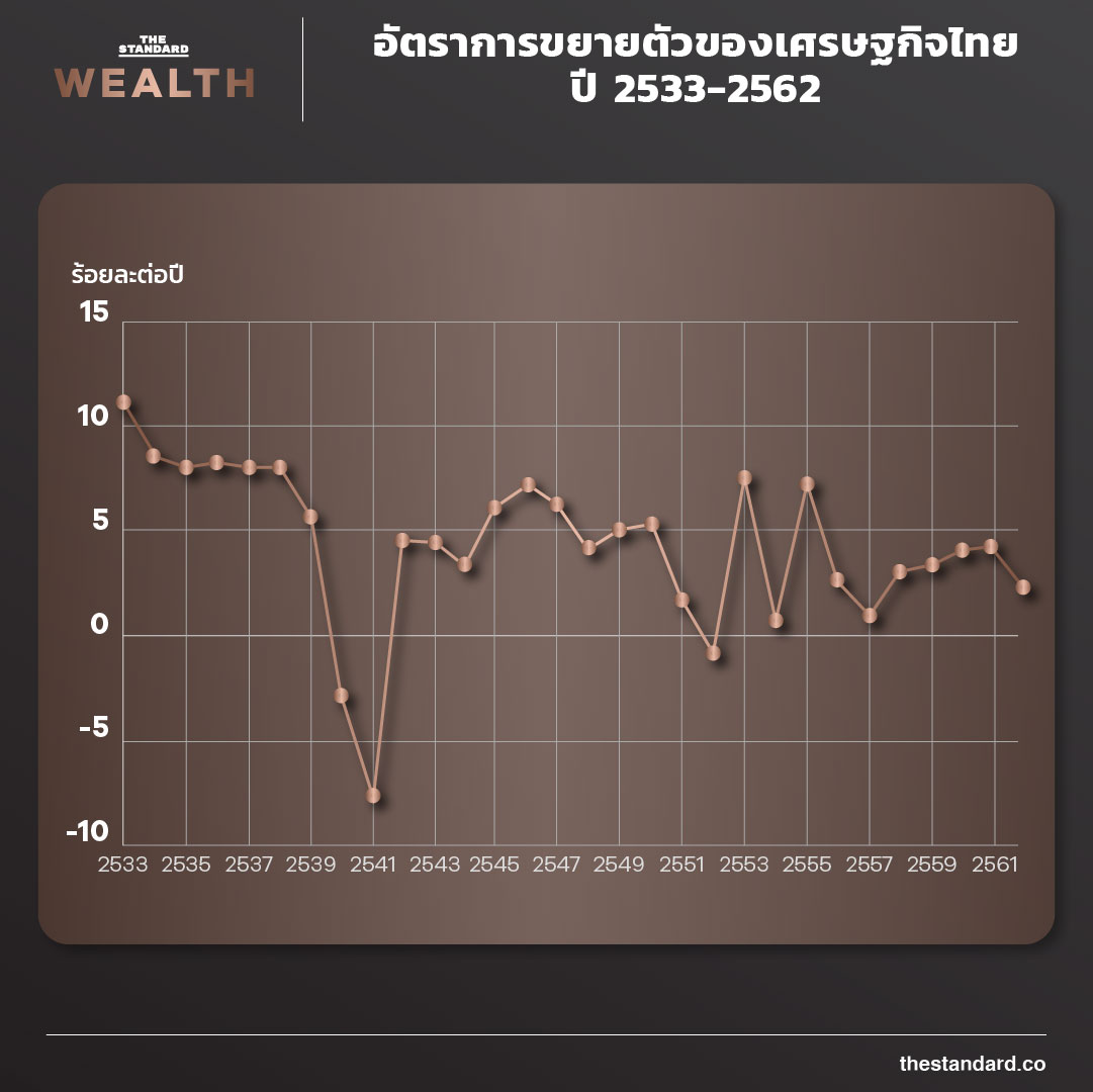 ที่ผมกังวลที่สุดคือ วิกฤตโควิด-19 จะมีผลถาวรต่อศักยภาพการขยายตัวของเศรษฐกิจไทย จากประสบการณ์ในอดีต หลังวิกฤตปี 2540-2541 และวิกฤตเศรษฐกิจโลกปี 2551-2552 เราไม่เคยกลับไปขยายตัวได้สูงเท่ากับค่าเฉลี่ย 5 ปี ก่อนวิกฤต (ร้อยละ 7.6 และร้อยละ 5.6 ตามลำดับ) ได้อีกเลย ซึ่งหมายความว่า อัตราเฉลี่ยร้อยละ 5 ในช่วงปี 2565-2570 ที่ผมสมมติไว้ในส่วนของเส้นประเป็นสิ่งที่ท้าทายยิ่ง