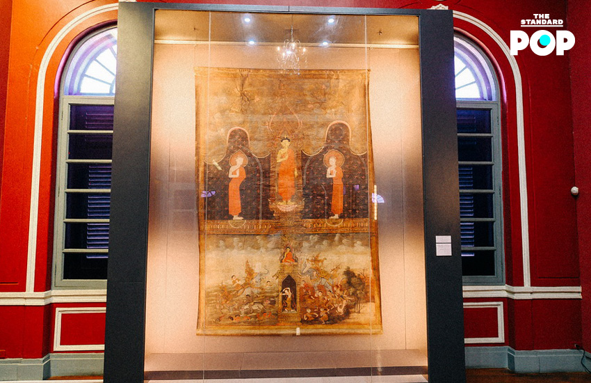 ผึ้ง-ปัทมา ก่อทอง ภัณฑารักษ์ชำนาญการ พิพิธภัณฑสถานแห่งชาติ ไม่เฉลยเราในทันที แต่กลับพาเดินขึ้นบันไดไปบนชั้น 2 ของพิพิธภัณฑสถานแห่งชาติ หอศิลป (หอศิลป์เจ้าฟ้า) เพื่อชมงานทัศนศิลป์ยุคแรกของรัตนโกสินทร์ที่เรียกว่า ‘ภาพพระบฏ’ งานเขียนที่มีพื้นฐานคือพระพุทธศาสนา เล่าเรื่องพุทธประวัติและชาดก “ภาพเขียนสมัยนั้นจัดทำขึ้นเพื่อบูชา อะไรที่ดีที่สุด เจ๋งที่สุด เราจะส่งให้วัด” คุณผึ้งเน้นย้ำกับเรา ก่อนจะพาเดินลงมาที่ชั้นล่างของอาคารอีกครั้ง