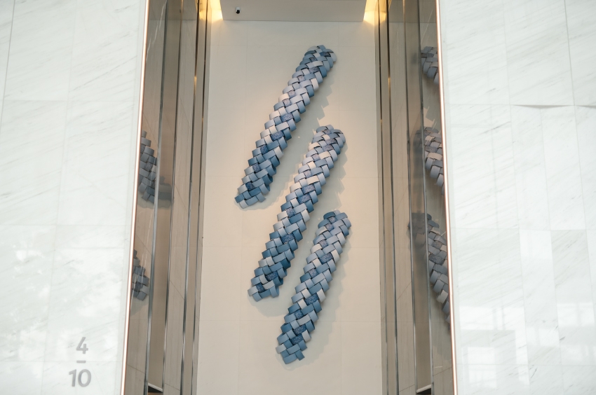 งานชิ้นนี้ชื้อว่า ‘The Cradle’ ซึ่งถูกติดตั้งอยู่ตรงบริเวณโถงลิฟต์อาคารสำนักงาน โดยมีรูปแบบเป็นงานเซรามิกที่มีลักษณะเหมือนถูกสานเข้าไว้ด้วยกัน โดยความยากของการรังสรรค์งานชิ้นนี้อยู่ที่การออกแบบเซรามิกให้เป็นรูปทรงโค้งที่เผาแล้วไม่ยุบตัว และขณะเดียวกันก็ยังเป็นชิ้นงานที่มีน้ำหนักมากอีกด้วย จึงต้องมีการพูดคุยกับวิศวกรอย่างใกล้ชิด เพื่อคำนวณน้ำหนักสำหรับการติดตั้งให้พอดี