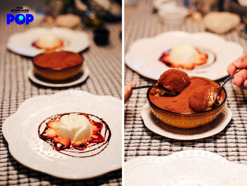 ปิดท้ายด้วยเมนูของหวานอย่าง Homemade Panna Cotta พานาคอตต้าเนื้อแน่น เด้ง เสิร์ฟพร้อมสตรอว์เบอร์รีและซอสช็อกโกแลต เมื่อลองตักกินแล้วจะค้นพบว่า รสชาติของทางร้านไม่เหมือนที่ไหนที่เคยกินมาก่อน เพราะเนื้อของพานาคอตต้ามีกลิ่นของเลมอน และ Homemade Tiramisu ที่นำคุกกี้ Savoiardi ไปชุบในกาแฟ และเสิร์ฟพร้อมชีสมาสคาร์โปนสูตรอิตาเลียนแท้ๆ หอมกาแฟและนุ่มด้วยชีส