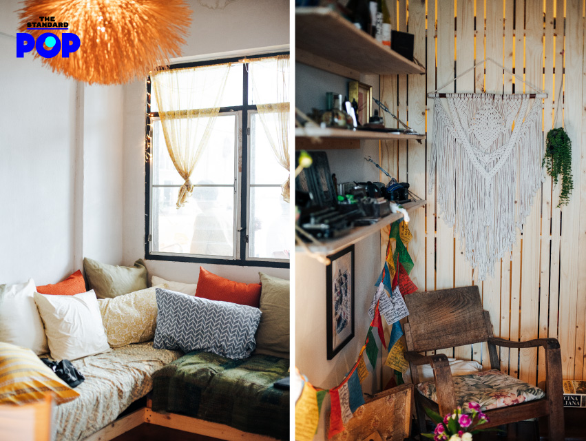ห้องนี้เป็นห้องเล็กๆ ตามแบบอพาร์ตเมนต์ทั่วไป กลางห้องมีชุดโต๊ะเก้าอี้ไม้ที่ถูกจัดวางไว้ ให้ความรู้สึกเหมือนได้มานั่งกินข้าวที่บ้านเพื่อนสักคน ตามผนังห้องมีภาพวาดและภาพถ่ายประดับไว้มากมาย ส่วนมุมห้องมีเครื่องเล่นแผ่นเสียงพร้อมคอลเล็กชันแผ่นเสียงหลายสิบแผ่นให้คุณเลือกฟังได้ตามใจชอบ ส่วนระเบียงถูกเนรมิตให้เป็นครัวสะอาด เรียบร้อย สวยงาม มีหน้าต่างบานใหญ่ที่สามารถเปิดออกไปชมวิวด้านนอกได้ ระหว่างรออาหารคุณจะนั่งอยู่ที่โต๊ะหรือไปเอนหลังนั่งเล่นที่โซฟามุมห้องที่ทีมงานของร้านเป็นคนทำเองตั้งแต่ดอกไม้ไปจนถึงเย็บปลอกหมอนก็ได้ โซฟาตัวนี้ตั้งอยู่ติดกับหน้าต่างครัว ทำให้คุณแอบมองการทำอาหารของพี่โป้และทีมงานได้แบบสนุกๆ และพี่โป้อาจเรียกคุณไปลองม้วนเส้นพาสต้าด้วยตัวเอง