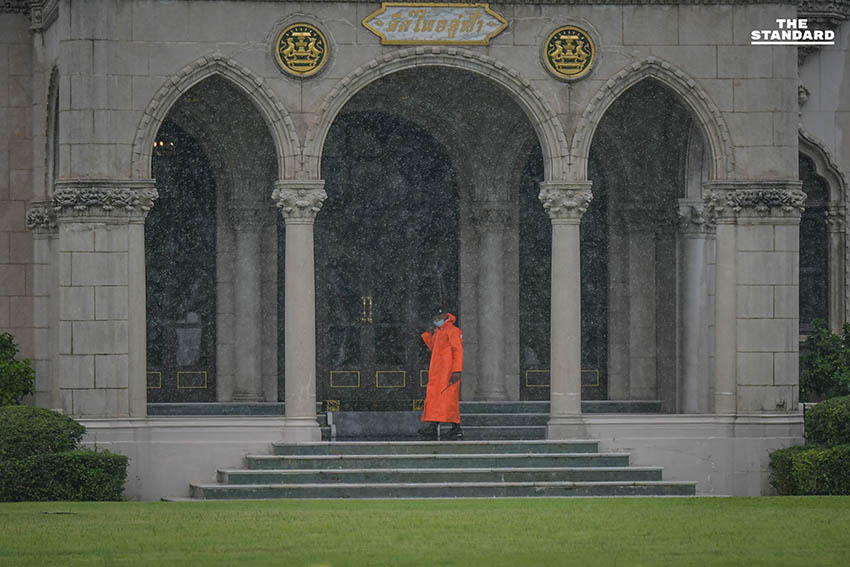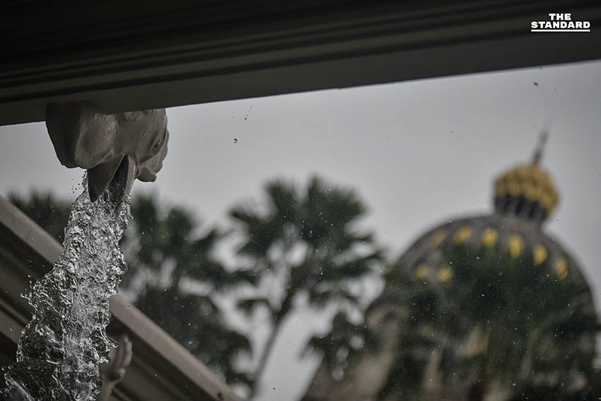 ฝนตกหลังคาตึกสันติไมตรีทำเนียบรั่ว ระหว่างนายกรัฐมนตรีแถลงผลประชุมคณะรัฐมนตรี