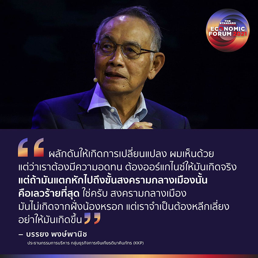 “ผลักดันให้เกิดการเปลี่ยนแปลง ผมเห็นด้วย แต่ว่าเราต้องมีความอดทน ต้องออร์แกไนซ์ให้มันเกิดจริง แต่ถ้ามันแตกหักไปถึงขั้นสงครามกลางเมืองนั้นคือเลวร้ายที่สุด ใช่ครับ สงครามกลางเมืองมันไม่เกิดจากฝั่งน้องหรอก แต่เราจำเป็นต้องหลีกเลี่ยงอย่าให้มันเกิดขึ้น”
