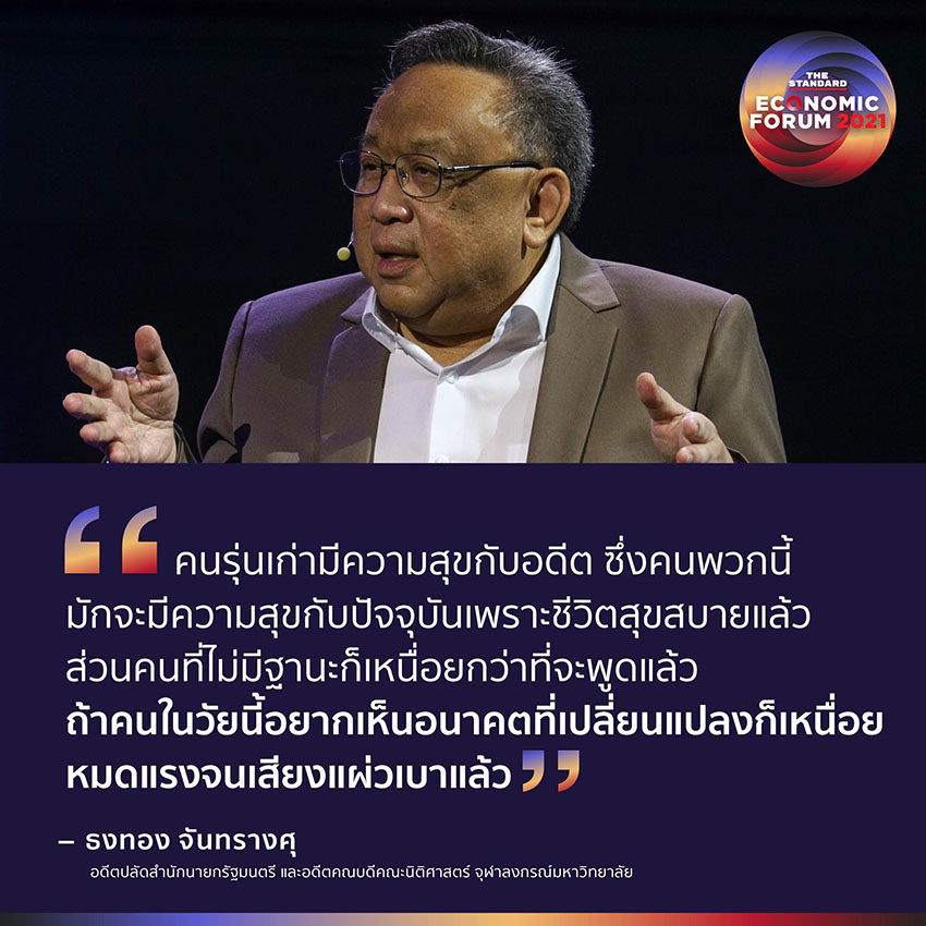 “คนรุ่นเก่ามีความสุขกับอดีต ซึ่งคนพวกนี้มักจะมีความสุขกับปัจจุบันเพราะชีวิตสุขสบายแล้ว ส่วนคนที่ไม่มีฐานะก็เหนื่อยกว่าที่จะพูดแล้ว ถ้าคนในวัยนี้อยากเห็นอนาคตที่เปลี่ยนแปลงก็เหนื่อย หมดแรงจนเสียงแผ่วเบาแล้ว”