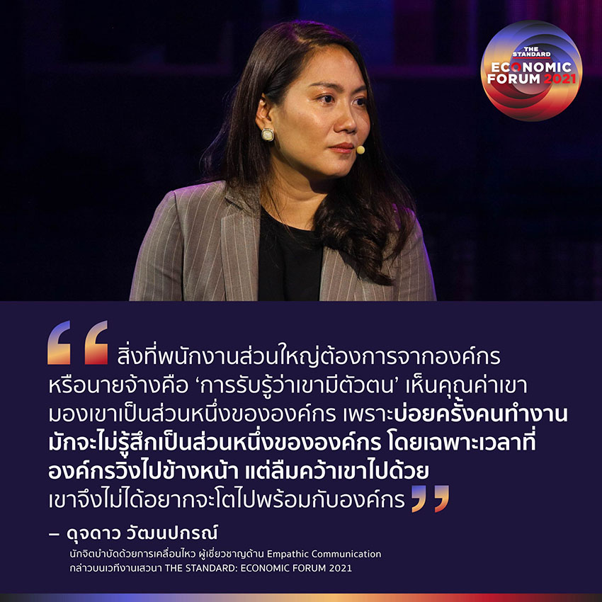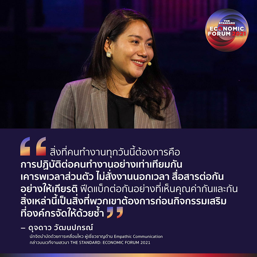 ดุจดาว วัฒนปกรณ์ นักจิตบำบัดด้วยการเคลื่อนไหว ผู้เชี่ยวชาญด้าน Empathic Communication กล่าวบนเวทีงานเสวนา THE STANDARD: ECONOMIC FORUM 2021