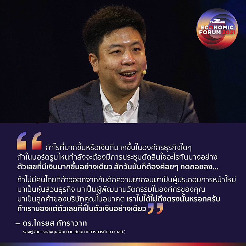 “ถ้าไม่มีคนไทยที่ก้าวออกจากกับดักความยากจนมาเป็นผู้ประกอบการหน้าใหม่ มาเป็นหุ้นส่วนธุรกิจ มาเป็นผู้พัฒนานวัตกรรมในองค์กรของคุณ มาเป็นลูกค้าของบริษัทคุณในอนาคต เราไปได้ไม่ถึงตรงนั้นหรอกครับ ถ้าเรามองแต่ตัวเลขที่เป็นตัวเงินอย่างเดียว”