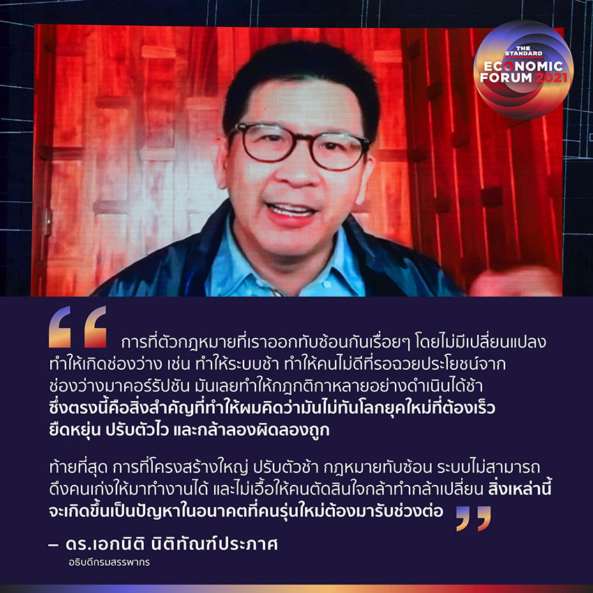 “การที่ตัวกฎหมายที่เราออกทับซ้อนกันเรื่อยๆ โดยไม่มีเปลี่ยนแปลง ทำให้เกิดช่องว่าง เช่น ทำให้ระบบช้า ทำให้คนไม่ดีที่รอฉวยประโยชน์จากช่องว่างมาคอร์รัปชัน มันเลยทำให้กฎกติกาหลายอย่างดำเนินได้ช้า ซึ่งตรงนี้คือสิ่งสำคัญที่ทำให้ผมคิดว่ามันไม่ทันโลกยุคใหม่ที่ต้องเร็ว ยืดหยุ่น ปรับตัวไว และกล้าลองผิดลองถูก