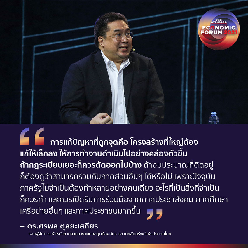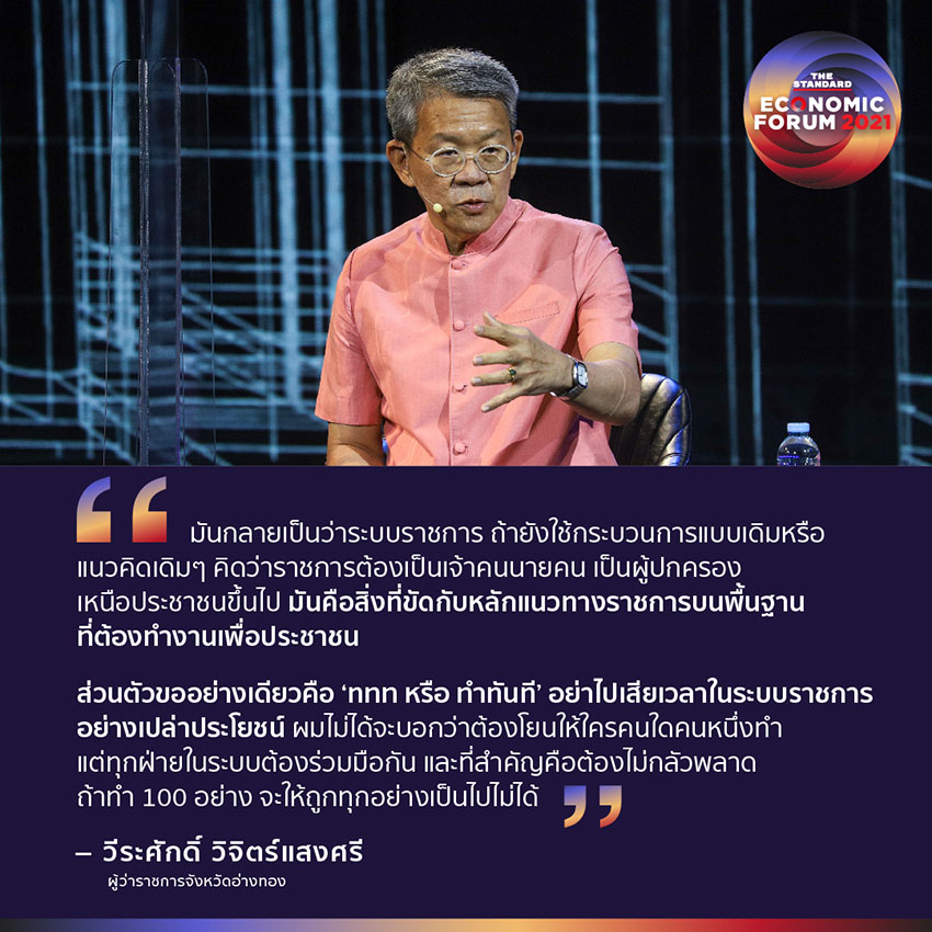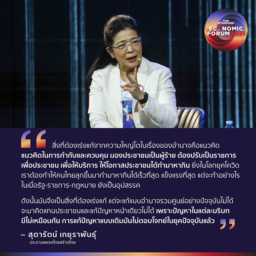 “สิ่งที่ต้องเร่งแก้จากความใหญ่โตในเรื่องของอำนาจคือแนวคิด แนวคิดในการกำกับและควบคุม มองประชาชนเป็นผู้ร้าย ต้องปรับเป็นราชการเพื่อประชาชน เพื่อให้บริการ ให้โอกาสประชาชนได้ทำมาหากิน ยิ่งในโลกยุคโควิด เราต้องทำให้คนไทยลุกขึ้นมาทำมาหากินได้เร็วที่สุด แข็งแรงที่สุด แต่จะทำอย่างไรในเมื่อรัฐ-ราชการ-กฎหมาย ยังเป็นอุปสรรค