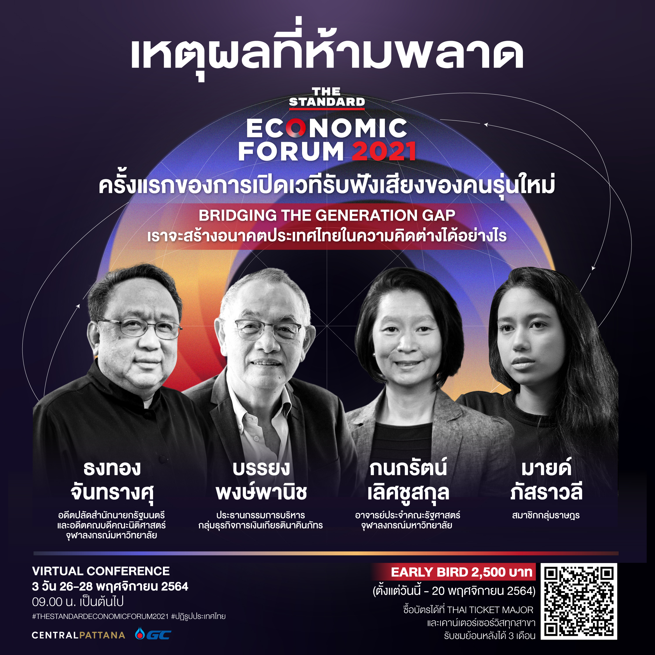 เตรียมเปิดหู เปิดตา เปิดใจ รับชมการล้อมวงสนทนาครั้งแรกของ ศาสตราจารย์พิเศษธงทอง จันทรางศุ, บรรยง พงษ์พานิช, กนกรัตน์ เลิศชูสกุล และ มายด์-ภัสราวลี ธนกิจวิบูลย์ผล ในหัวข้อ ‘Bridging the Generation Gap เราจะสร้างอนาคตประเทศไทยในความคิดต่างได้อย่างไร’ บนเวที THE STANDARD ECONOMIC FORUM 2021 วันที่ 28 พฤศจิกายน 2564