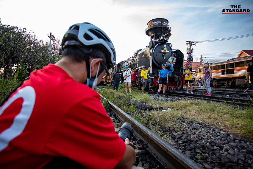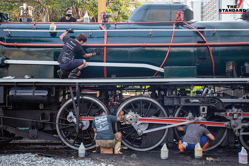 นอกจากนี้ในทีมงานที่เตรียมพร้อมหัวรถไฟในวันนี้ THE STANDARD มีโอกาสได้พูดคุยกับทีม SL Team ทีมจิตอาสาที่มาช่วยเตรียมพร้อมขบวนรถจักรไอน้ำในวันนี้ ซึ่งพวกเขาได้เล่าว่า สาเหตุที่เข้ามาทำในส่วนนี้ เนื่องจากมีความหลงใหลในตัวของรถไฟเป็นอย่างมาก และทุกชิ้นส่วนของรถจักรไอน้ำที่เห็นในสถานีธนบุรีแห่งนี้ เต็มไปด้วยเรื่องราวที่จะสามารถเชื่อมโยงพวกเขาไปสู่วิธีการคิดของวิศวกรญี่ปุ่นผู้ที่ออกแบบหัวรถไฟเหล่านี้ในอดีต